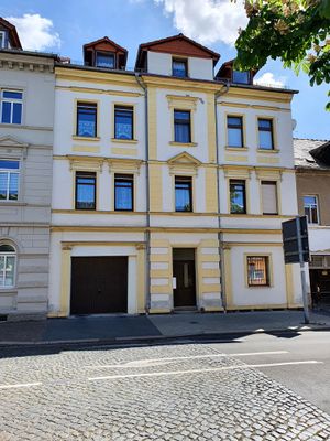 Albert-Kuntz-Straße 46, Mietshaus in Wurzen, geschlossene Bebauung, ehemals mit Laden, Gründerzeitfassade mit klassizistischen Anklängen, Mittelrisalit gerahmt mit gequaderten Lisenen, baugeschichtlich von Bedeutung. Laden gegliedert mit korinthische Pilaster mit Architrav