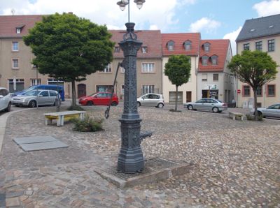 Pflasterung des Marktplatzes und Handschwengelpumpe vor dem Rathaus Markt -