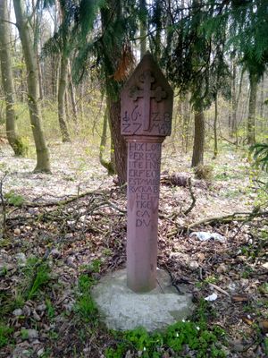 Schwedenstein, Ältester Bildstock auf Hettinger Gemarkung, Inschrift bedeutet etwa An diesem Ort wurde Markus Ruck aus Hettingen von einem schwedischen Reiter getötet