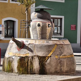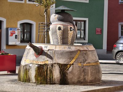 Chinese fountain, künstlerisch gestalteter Springbrunnen mit chinesischen Formelementen vor dem Rathaus von Dietfurt a.d.Altmühl