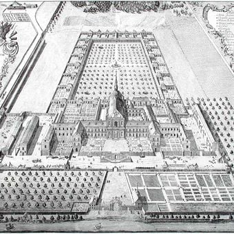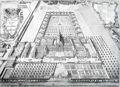 La Certosa di Bosserville sorge lungo il fiume Meurthe, con un edificio principale, due ali laterali e una chiesa barocca al centro.