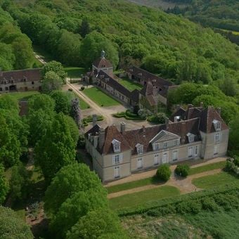 Il Château du Fey si erge su una collina di fronte alla Valle dell'Yonne, con un viale che si estende lungo il bosco circostante.