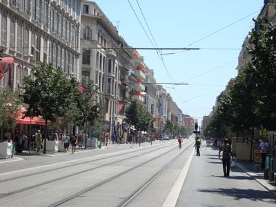 Il viale include una moderna linea tranviaria che collega i principali punti di trasporto e le zone commerciali di Nizza.