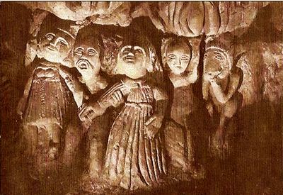 Ogni scultura mostra uno stile naif distinto con corpi sproporzionati e volti espressivi scolpiti direttamente nelle pareti di tufo.