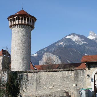 Il mastio centrale del Château de Faverges si erge sopra la città, con mura in pietra e una galleria circolare che offre viste sulle valli.