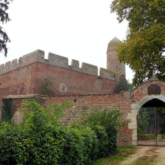 Il castello presenta una cinta muraria quadrangolare in mattoni rossi, con una torre campanaria che si erge da uno degli angoli strutturali.