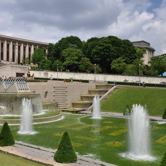 La Fontana del Trocadero presenta venti cannoni d'acqua che proiettano getti per cinquanta metri verso la Torre Eiffel.