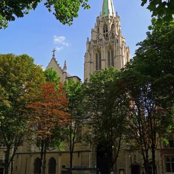 La Chiesa Americana di Parigi sorge vicino alla Senna, caratterizzata da una guglia verde ed elementi architettonici neogotico con vetrate colorate.