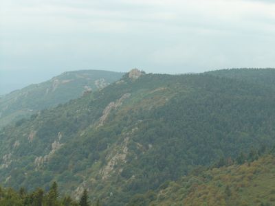 Signal de Coucoulude si innalza a 1448 metri sul livello del mare, con affioramenti rocciosi e pendii boscosi nel Massiccio Centrale.