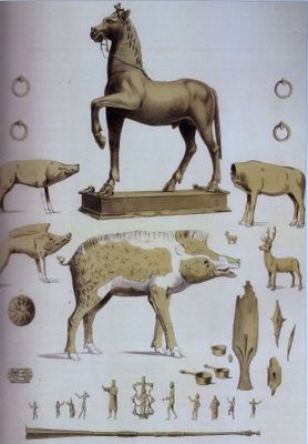 Il Tesoro di Neuvy-en-Sullias contiene trentatré pezzi in bronzo tra cui statue di animali, figure umane e un cavallo alto un metro.