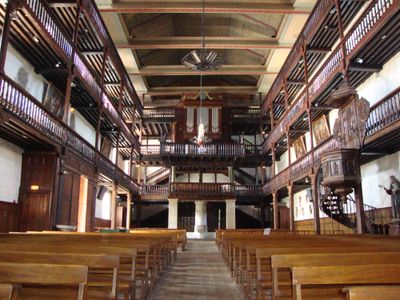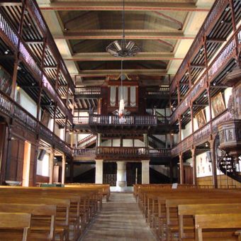 La Chiesa di Saint-Vincent presenta un campanile ottagonale, tre livelli di balconate in legno e un ingresso rinascimentale con archi semicircolari e motivi floreali.