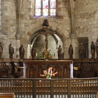 Choir fence in Maurs, liturgical fence delimited by low stalls, closed by the communion table and frames materializing the accesses to the choir