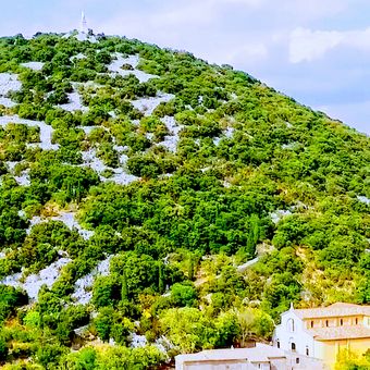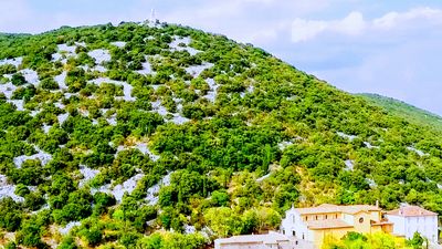Il santuario Notre-Dame-du-Suc si erge sulla cima di una collina a Brissac, offrendo viste panoramiche sulla valle dell'Hérault e sulle montagne circostanti nel dipartimento dell'Hérault nella regione dell'Occitania.