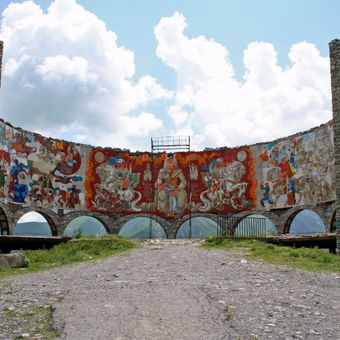 Il monumento circolare in pietra presenta sette alte colonne in cemento e si affaccia sulla Valle del Diavolo nelle montagne del Caucaso.
