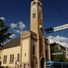 L'edificio della chiesa presenta muri in pietra, un campanile e grandi finestre che illuminano la navata principale attraverso pannelli di vetro colorato.