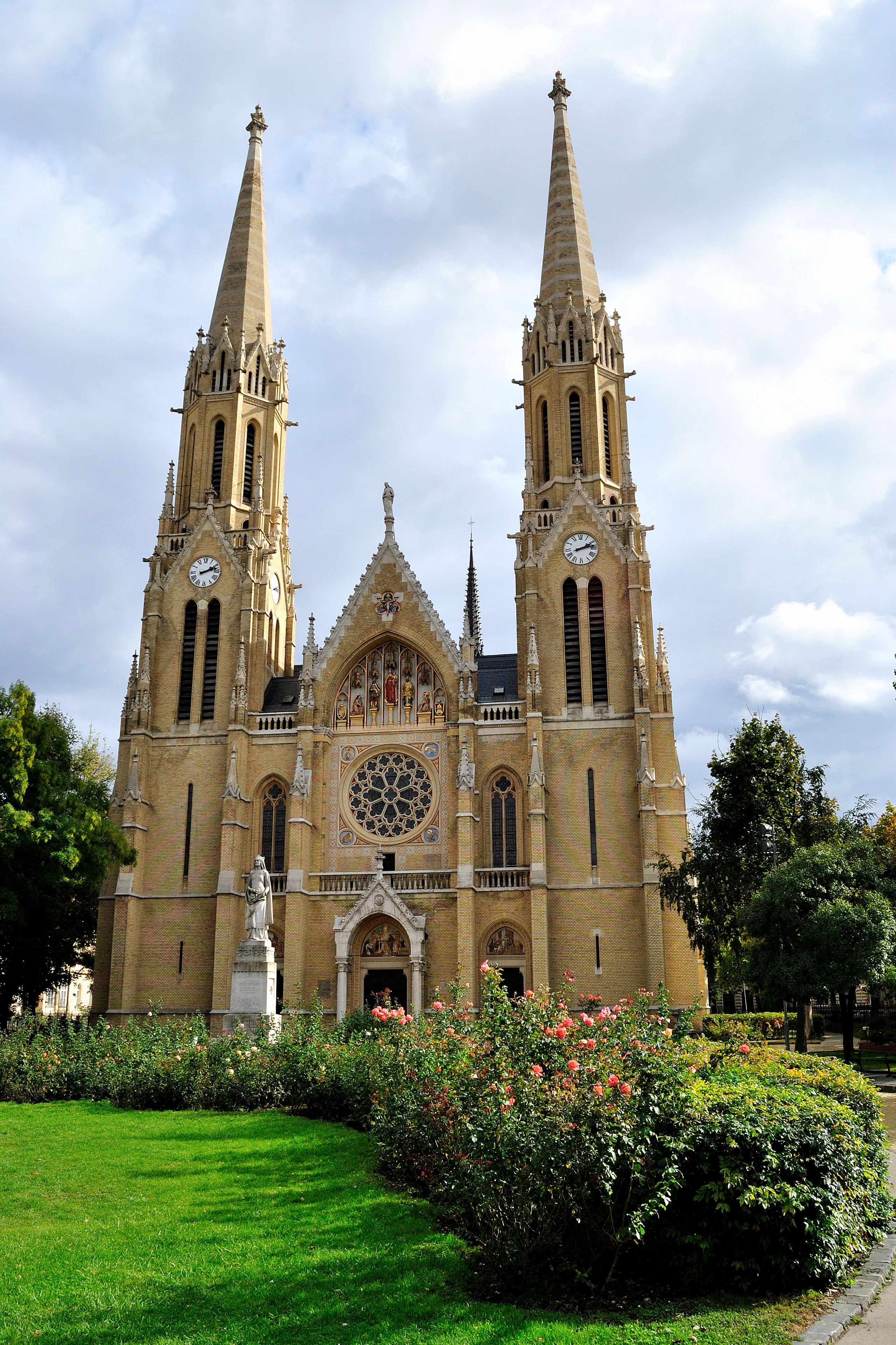 La Chiesa di Santa Elisabetta presenta due alte torri e si erge su Piazza Rozak, circondata da un parco pubblico con recinzioni in ferro.