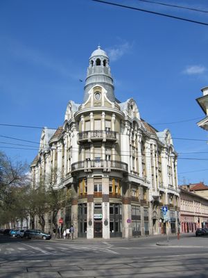 Situato vicino al centro di Szeged, l'edificio mantiene le sue caratteristiche esterne originali mentre ospita attività commerciali al piano terra.