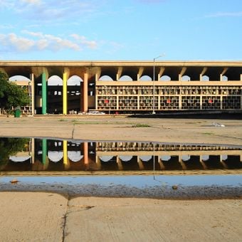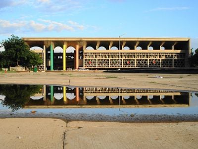 L'edificio dell'Alta Corte del Punjab e Haryana presenta linee orizzontali, motivi geometrici e superfici in cemento a vista progettate da Le Corbusier.