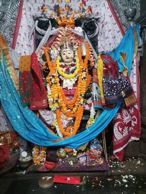 All'interno del tempio, un letto di pietra solida mostra segni di usura, che i locali attribuiscono al riposo della Dea Mangala dopo i suoi giri quotidiani.