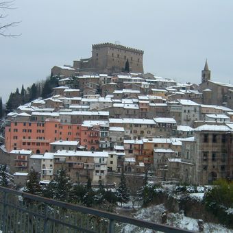 La città si trova a 509 metri di altitudine, con edifici in pietra, strade strette e il Castello Orsini posizionato su una collina.
