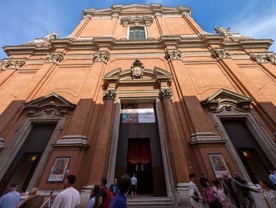 La Cattedrale di San Pietro presenta una facciata barocca progettata da Alfonso Torreggiani tra il 1743 e il 1747 con tre portali e strutture in mattoni rossi.
