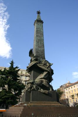 L'obelisco di bronzo si eleva per 23 metri su una base di granito rosso, con gruppi scultorei che raffigurano donne, un'aquila e un leone.