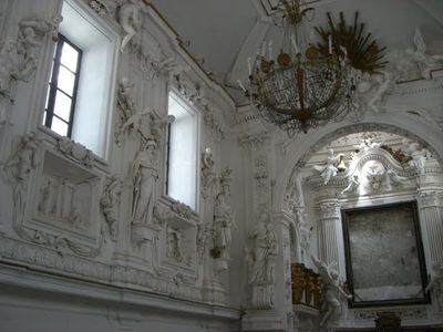 Otto grandi figure allegoriche delle Virtù adornano le pareti longitudinali, mentre l'area dell'altare presenta dettagli in marmo ed elementi in bronzo dorato.