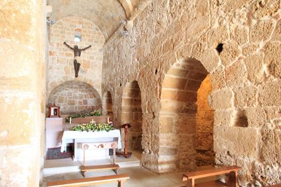 La chiesa di Sant'Efisio presenta archi tondi e pilastri robusti caratteristici dell'architettura romanica, con muri in pietra vicino al Mediterraneo.