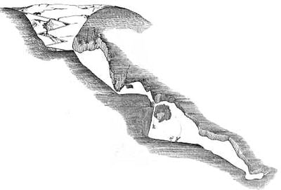La Grotta delle Palombe si estende per 120 metri di profondità nella formazione dei Monti Rossi, con diversi salti verticali e camere interconnesse.