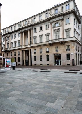 Situato in Via San Paolo 1 a Milano, il palazzo mantiene il suo ingresso originale con colonne doriche, mentre un ingresso secondario è stato aggiunto dopo il 1950.