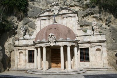 Il tempietto incorpora tre grotte naturali convertite in oratori, con una facciata in pietra travertino e una cupola centrale sostenuta da colonne doriche.
