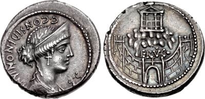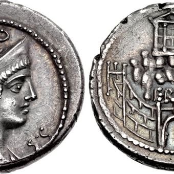 Un denario coniato nel 57 a.C. mostra la facciata del tempio sul retro, fornendo una testimonianza visiva del suo aspetto originale.
