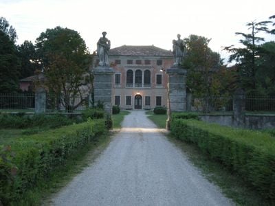 La villa presenta una struttura quadrata con due ali laterali, barchesse e un giardino neoclassico con sculture lungo il viale d'ingresso.
