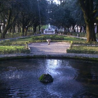 Quattro viali paralleli alberati convergono in un anfiteatro con un arco centrale in travertino progettato da Baldassarre Orsini nel Settecento.