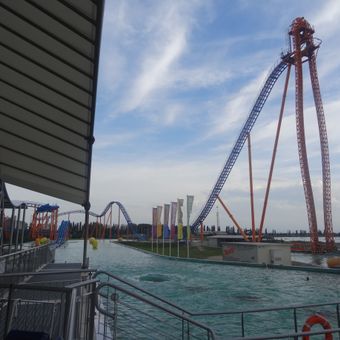 DiVertical unisce una struttura in acciaio con elementi acquatici, raggiungendo velocità di 95 chilometri orari attraverso una caduta di 50 metri.