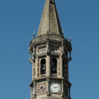 Il Campanile di San Nicolò si innalza per 96 metri con base ottagonale, cuspide triangolare e pareti in pietra di Moltrasio e granito.