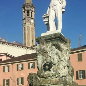 Il Monumento a Mario Cermenati sorge in una piazza centrale di Lecco, con una statua di marmo che raffigura una figura eretta con vista sul Lago di Como.