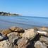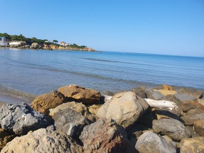 La spiaggia presenta una baia di sabbia bionda e formazioni rocciose, completata da acque blu cristalline sullo sfondo delle colline mediterranee.