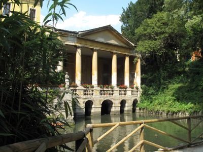 La Loggia Valmarana presenta sei colonne doriche che formano una struttura simile a un tempio vicino alla Roggia Seriola.