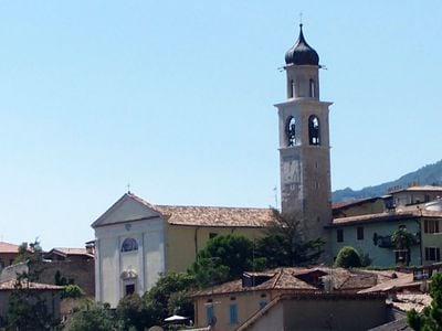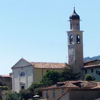 La chiesa presenta un campanile con tetto a cipolla in pietra bianca nel centro di Limone sul Garda.