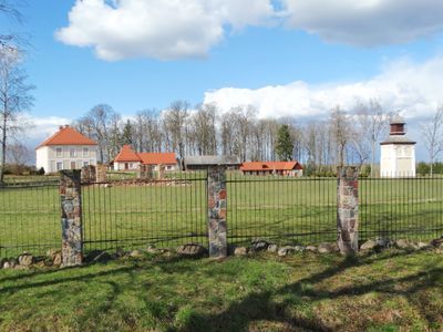 La dimora in pietra e legno mostra elementi architettonici lituani tradizionali con una facciata simmetrica e grandi finestre sui campi.