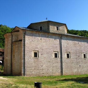 Il Monastero di Santa Maria di Prechista si erge come struttura in pietra con elementi architettonici bizantini medievali e affreschi religiosi sulle pareti.
