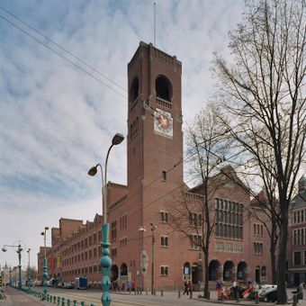Il Beurs van Berlage presenta muri in mattoni rossi, un tetto in ferro e vetro, pilastri in pietra e una torre dell'orologio alta 40 metri.