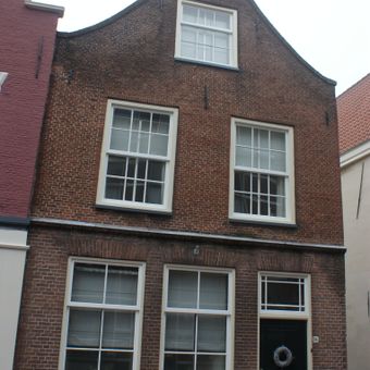 Pand met brede bakstenen gevel. Statig patriciershuis, rechte kroonlijst, gebeeldhouwde houten middenpartij in régence vorm. Hardstenen bordestrap met gesmeed ijzeren leuning