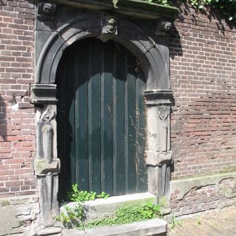 Natuurstenen tuinpoort met gebeeldhouwde sluitsteen, zijposten en kroonlijstconsoles, Rijksmonument op Bellinkstraat bij 4