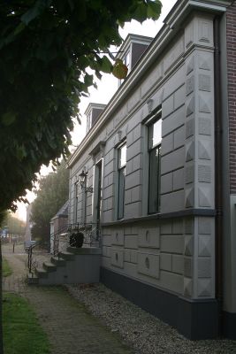 Witgepleisterd huis met verdieping en hoog schilddak, belangrijk door zijn ligging aan de Linge bij de toegang tot het dorp