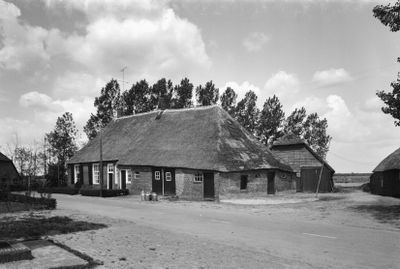 Boerderij met dwarshuis en langsdeel onder rieten wolfdak. Kruiskozijn met onderluiken