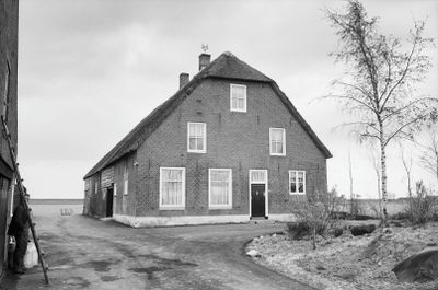 Boerderij met dwars voor de stal geplaatst woonhuis waarop verdieping en rieten zadeldak