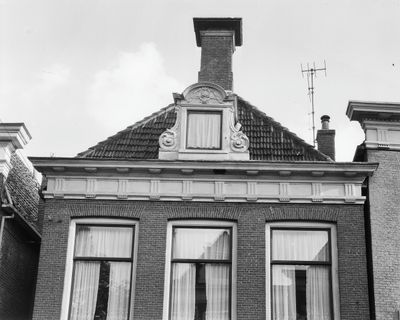 Hoog pand met vernieuwde voorgevel met lage vensters op zolderverdieping en kroonlijst onder zadeldak met voorschild waarboven topschoorsteen met bord