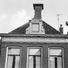 Hoog pand tegen klokgevel met natuurstenen aanzetkrullen en kroonlijst met emblemen onder zadeldak